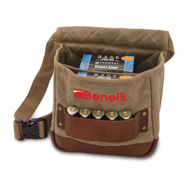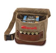 Benelli Lodge Large Shell Pouch, Olive Waxed Cotton. Easily transport multiple boxes of shells, loose or otherwise, at once in the Large Shell Pouch from Benelli's Lodge Collection. Constructed of handsome diamond-stitched waxed cotton with leather accents and a durable 600D interior, it also features uniques shell loops for immediate access to five shells when quick follow-up shots are required. Measures 9.5" x 9.5" x 5".
