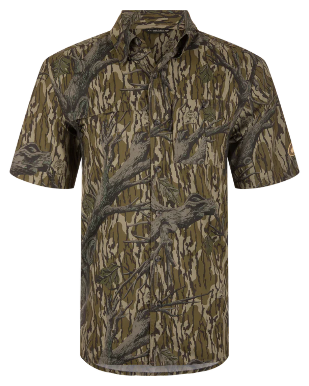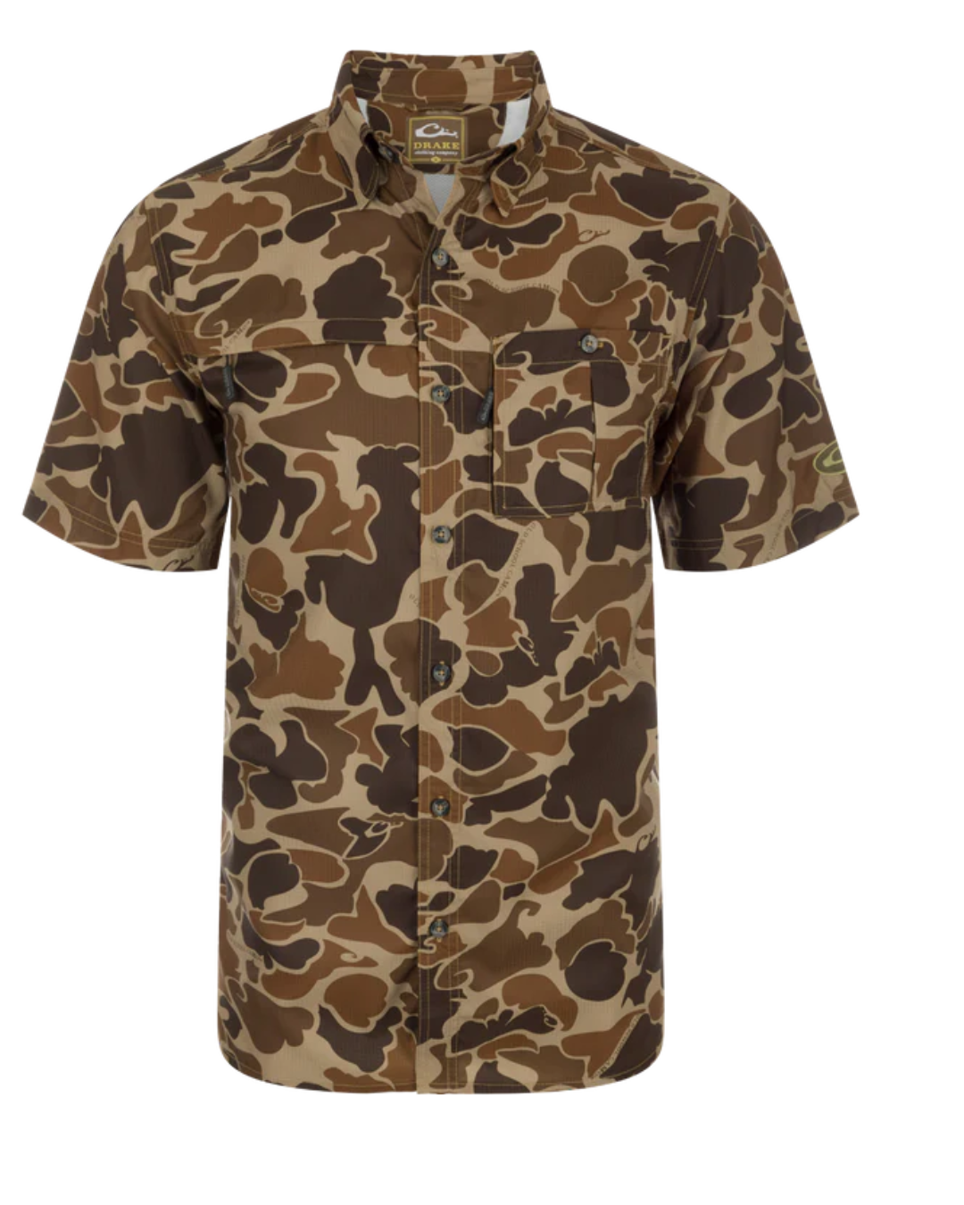 The Drake 8 Shot Shirt is made from a lightweight Dobby fabric featuring our exclusive Old School Camo pattern. The performance fabric is featherweight at 71 GSM which allows moisture to wick quickly from the body. It also has a UPF30 rating for sun protection and has a natural stretch for ease of movement. The Drake 8 Shot has a classic fit, a hidden button-down collar, and a vented cape back. The 8 Shot features a right chest pocket with a horizontal hidden zipper and a button through the left chest pocket with a hidden vertical zipper. It has a split tail hem which allows you to wear tucked or untucked. Classic styling and technical features will make The Drake 8 Shot one of your soon-to-be favorites.