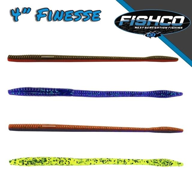 Finesse Worms from FishCo are just the thing when the bite gets a tough or you're fishing clear or pressured water. The FishCo 4" Finesse Worm is a small version of our 6" or 8" Finesse Worms and can be rigged in a variety of ways, including wacky style on a small hook, splitshot or on a shakey or finesse jig head. FishCo's supple plastic is life like to the touch and gives the Finesse Worm a seductive action that bass cant resist