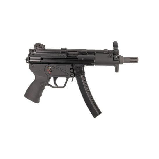 The MAC 5K stands out with its roller-delayed blowback system, enhancing reliability and reducing felt recoil for smoother operation. The threaded barrel, with a 1/2x28 thread pattern, makes this 9mm pistol suppressor-ready, expanding its tactical potential. Equipped with a rear diopter and adjustable sights, this pistol ensures precision targeting, while the paddle magazine release allows for quick and intuitive reloads.