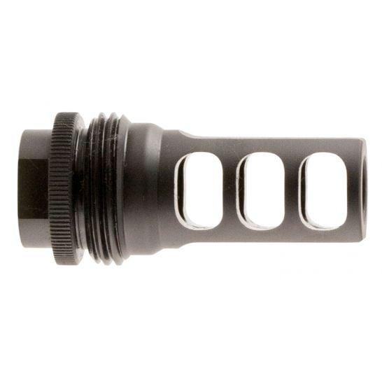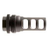 This 3-port muzzle brake is compatible with all SilencerCo ASR Mounts and with multiple thread and caliber options, you can shoot suppressed for any demand. It offers quick and easy one-hand-on, one-hand-off attachment and detachment. The 3-port design effectively reduces felt recoil and muzzle climb. Each ASR muzzle brake comes with a shim set and rocksett for easy application.